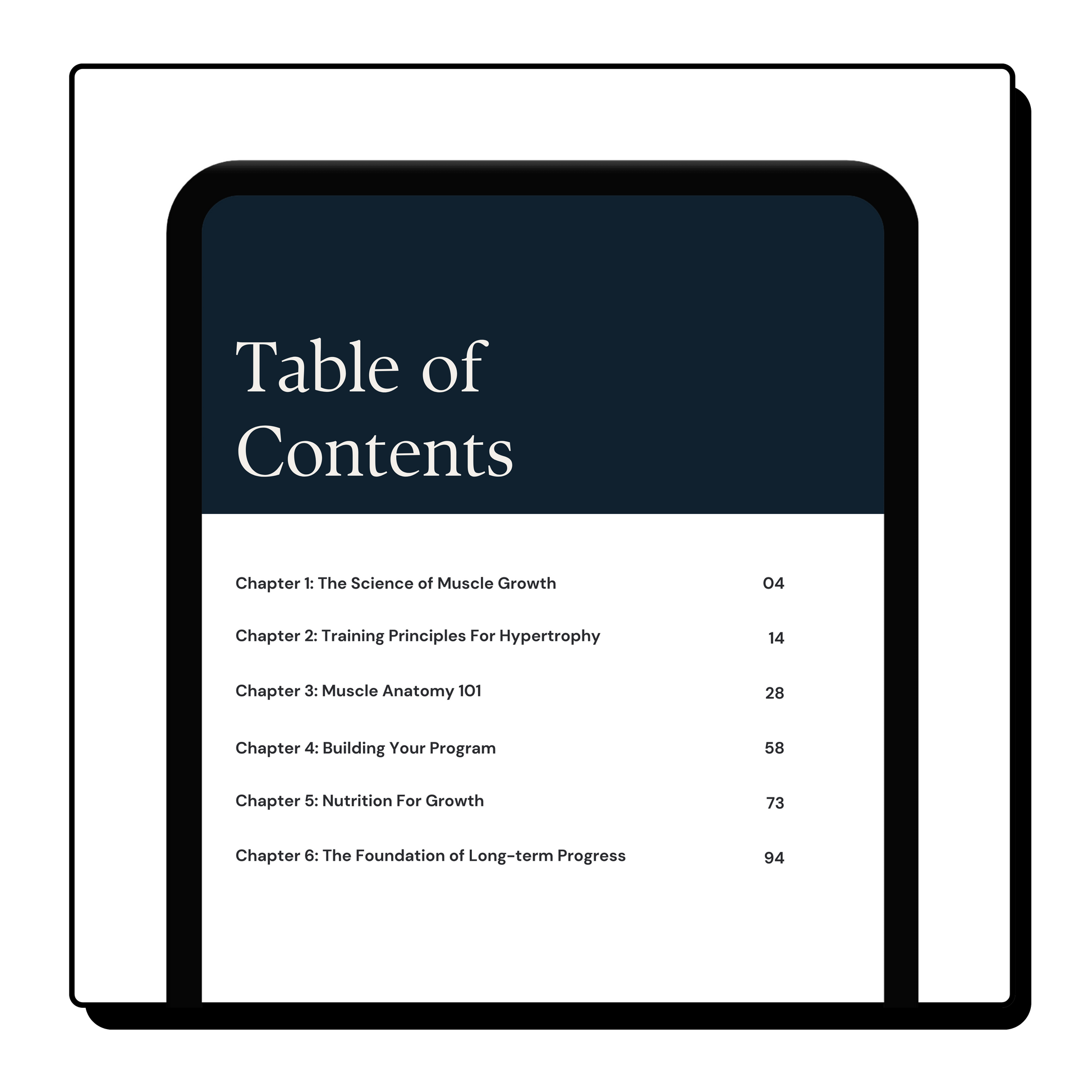 The ebook is 108 pages long and divided into 6 in-depth chapters. Each chapter covers a key part of muscle building, from the science of growth, to anatomy, training principles, program design, nutrition, and the foundations of long-term progress.